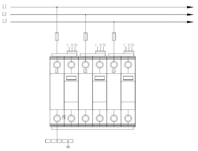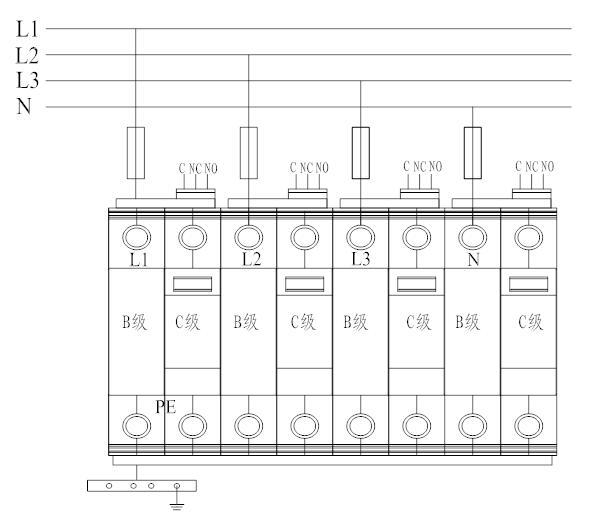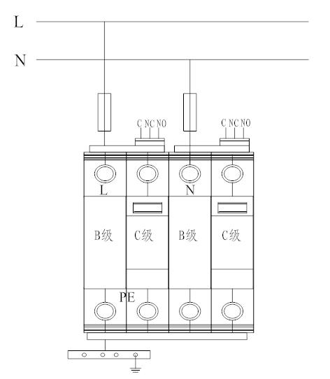 5.3 電源相線(L)、零線(N)分別接入電涌保護器相應(yīng)接線端子,保證牢固及可靠,將電涌保護器接地端與地線作良好電氣連接。